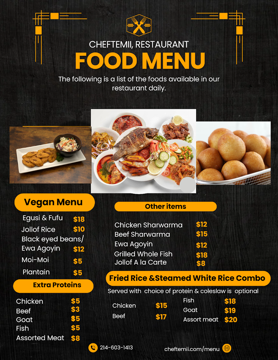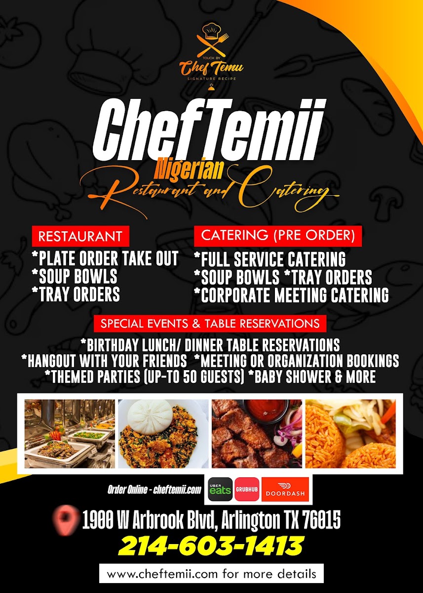 Welcome to ChefTemii - Nigerian Restaurant & Catering, a culinary gem nestled in Arlington, TX. Here, the vibrant and rich flavors of Nigeria come alive through an exciting menu that celebrates traditional dishes crafted with authentic African spices.